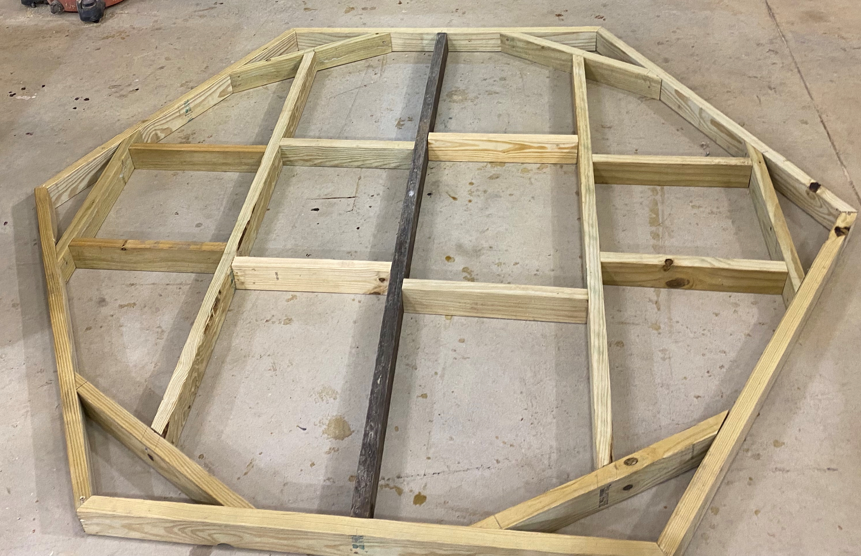 Each side is 48 inches long. That results in about 7 feet from side to side and 8 feet from point to point. 2x4's treated for ground contact were used. The studs are offset so screws can be run in from the ends. |